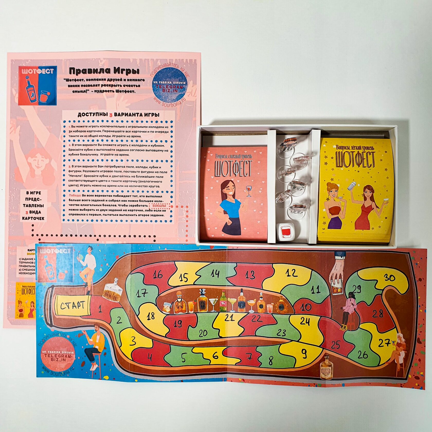 Розовое поле Попадая на данное поле Игрок вытягивает соответственно бледно-розовую карточку, в которой содержится сложный вопрос и фановое задание на тему крепкого алкоголя. Игрок должен дать либо правильный ответ на вопрос, либо выполнить фановое задание, за что заработать алкогольные бокальчики.