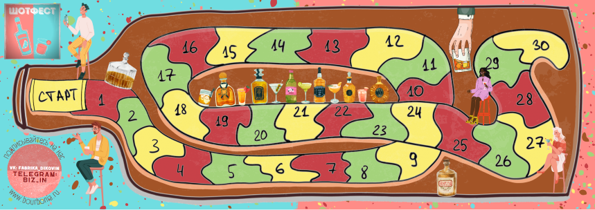 С игровым полем – игроки бросают алкогольный кубик и передвигают игровые фишки по игровому полю, выполняя задания в соответствии с цветом игровых полей.